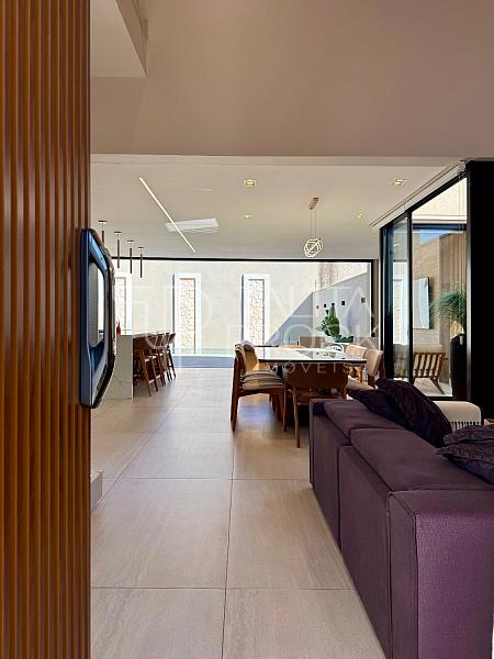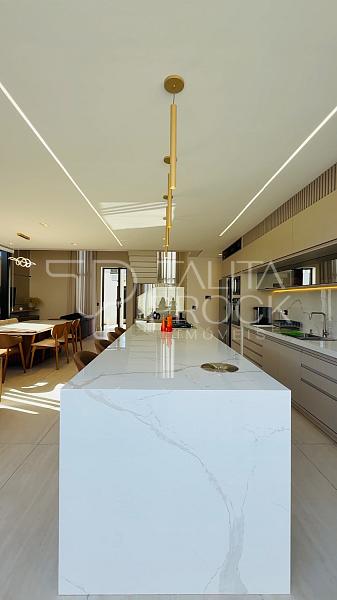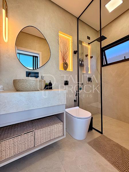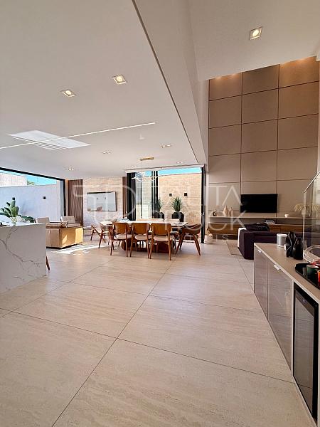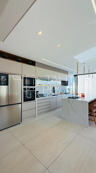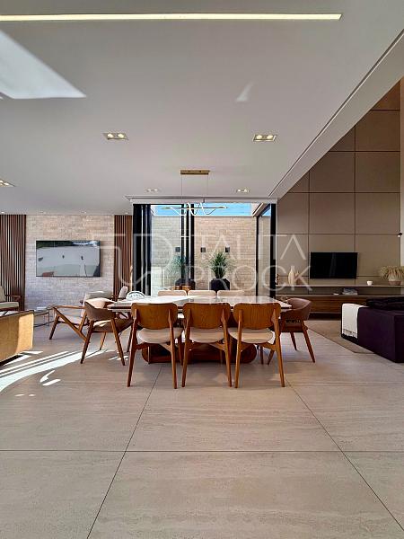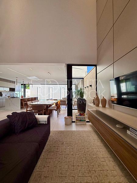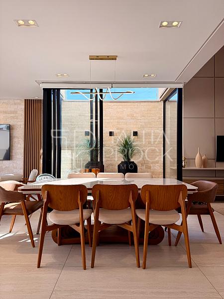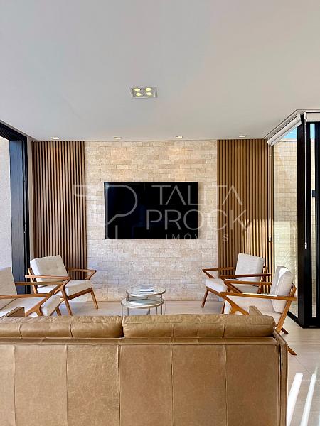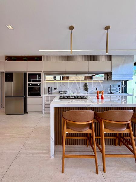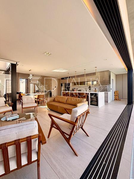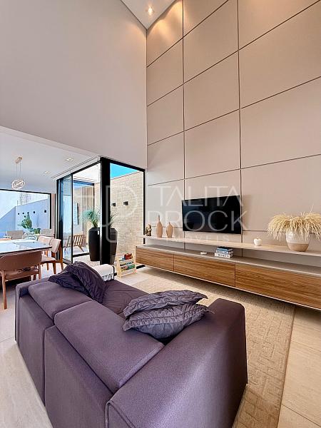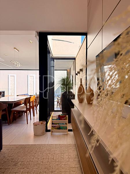 Os ambientes são amplos, integrados e proporcionam uma experiência de conforto e elegância em todos os espaços. Logo na entrada, a casa se revela de forma harmoniosa, conectando sala de TV, sala de jantar, living e uma cozinha gourmet completa — ideal para receber com estilo.