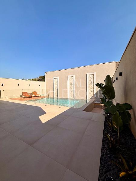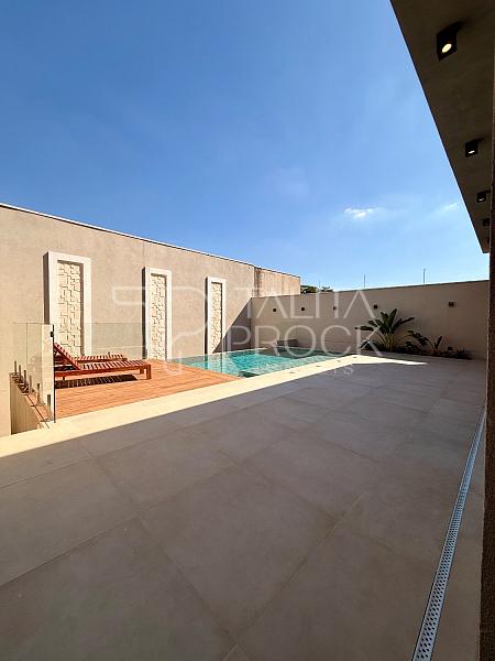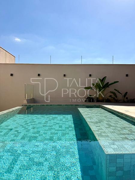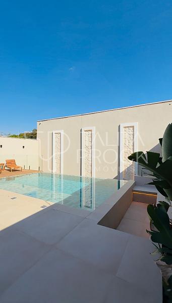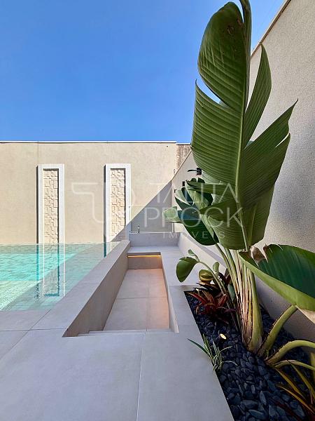 A área externa é um verdadeiro destaque, com piscina de borda infinita, totalmente revestida em pastilhas e equipada com aquecimento solar, criando um ambiente perfeito para lazer e relaxamento.