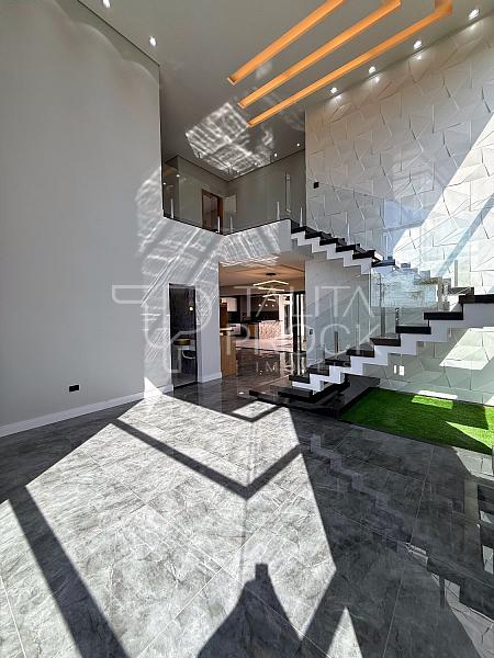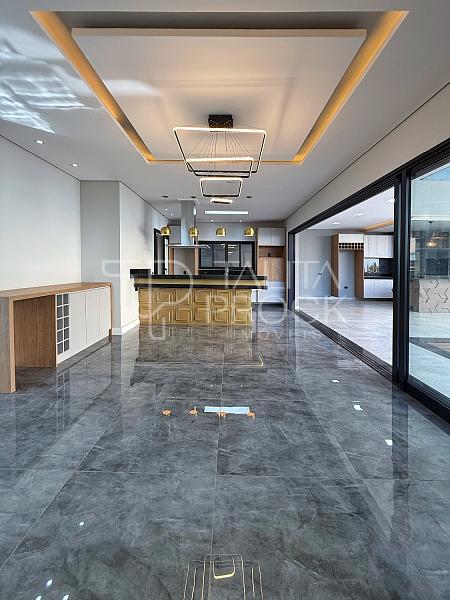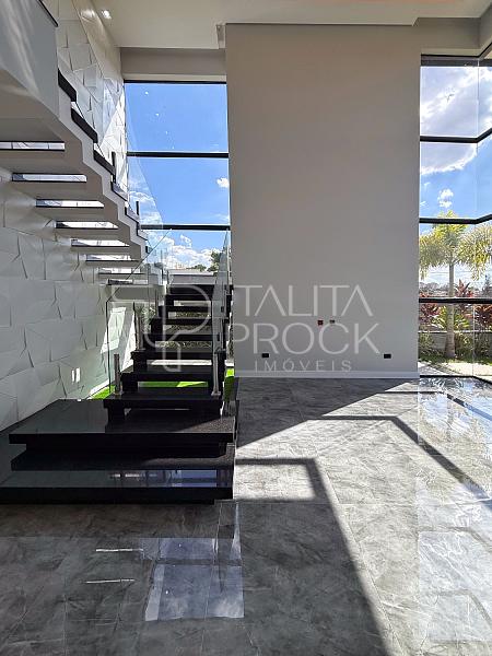 Ao adentrar, amplo espaço de estar com pé direito duplo, sala de TV reservada, lavabo social e cozinha interna com despensa e sala de jantar integrada. A lavaderia está ao lado com entrada pela garagem e estendal. A casa possui muita luz e ventilação natural.