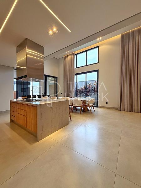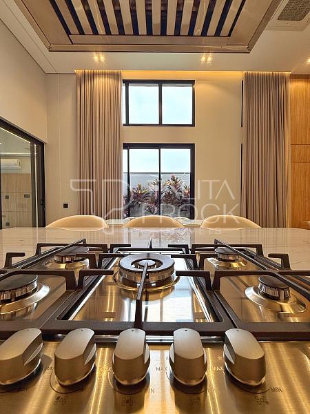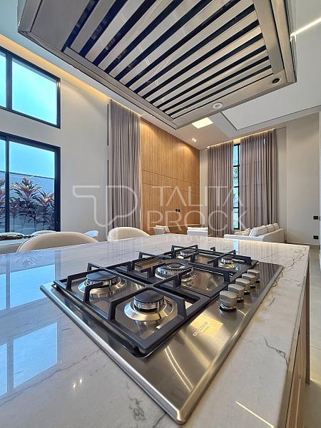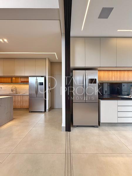 O living em dois ambientes é totalmente integrado à cozinha gourmet, criando um espaço amplo e acolhedor, perfeito para reunir família e amigos. A cozinha completa, com despensa e acabamento em Quartzito Bianco Unique, é equipada com eletrodomésticos Brastemp e LG de última geração.