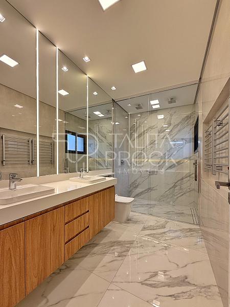 São 04 suítes, sendo uma delas com closet, além de 05 banheiros e 01 lavabo, todos com pedras nobres como Quartzo Super Branco, Mármore Branco Paraná e Granito Branco Siena.