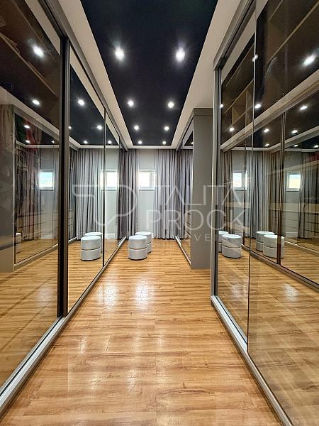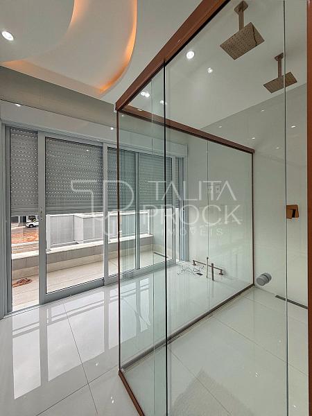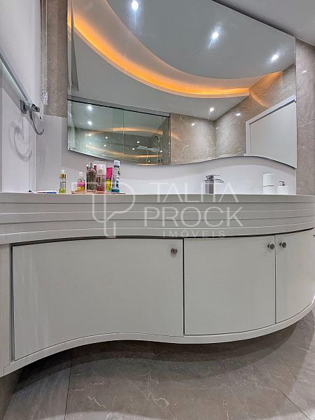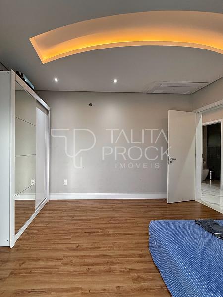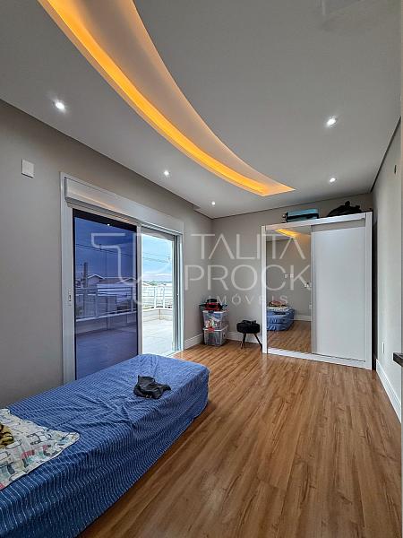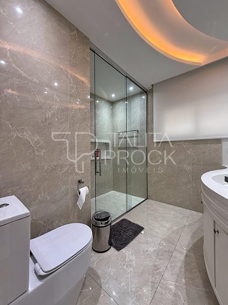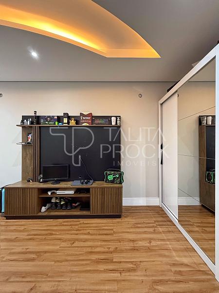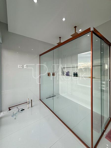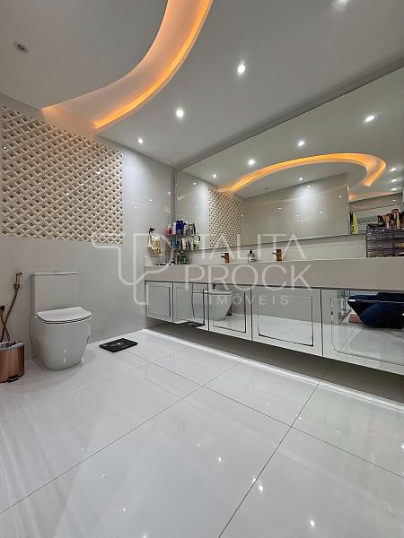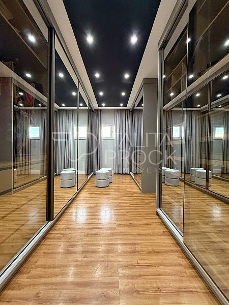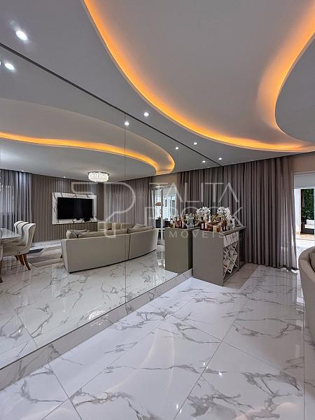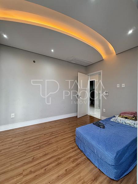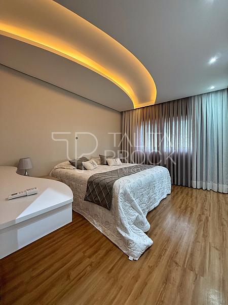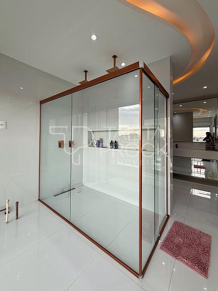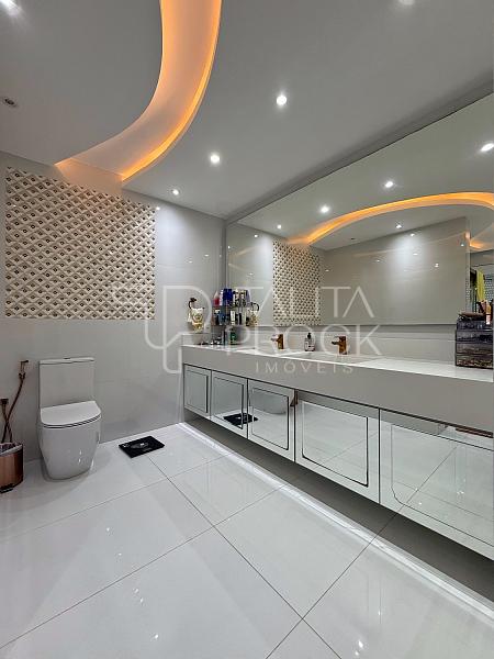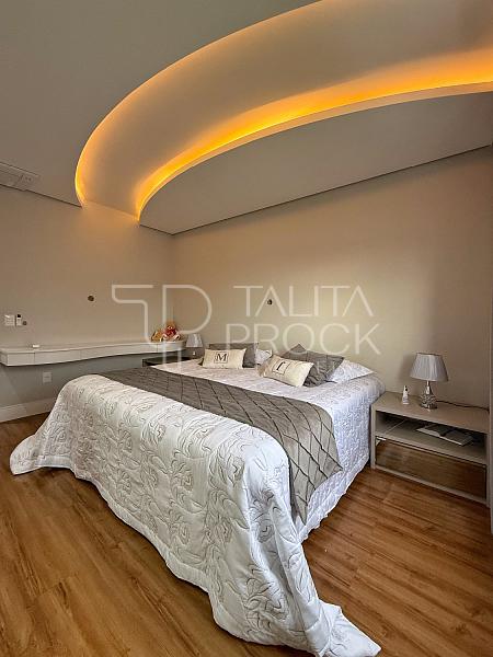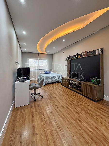 No piso superior, ficam os três dormitórios amplos, a suíte com mega closet e ótimo espaço no banheiro. Com persianas automatizadas e ambientes climatizados.