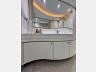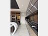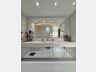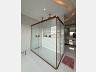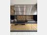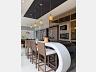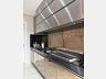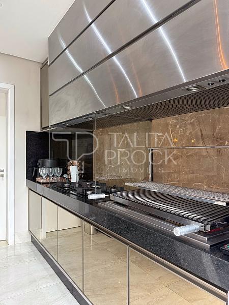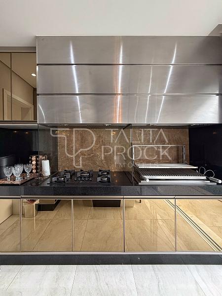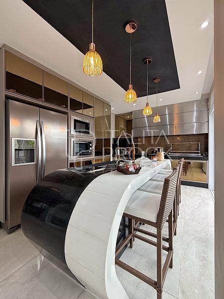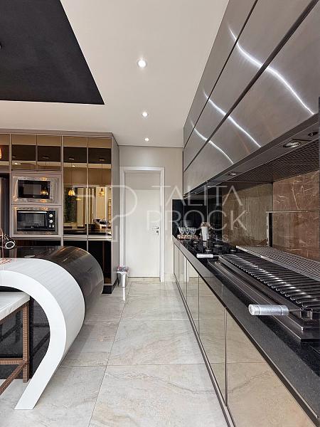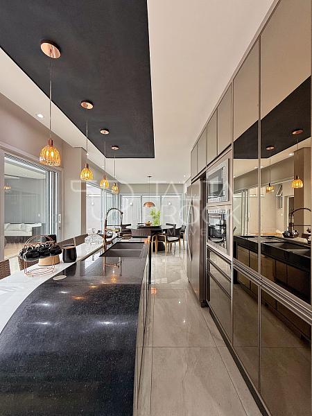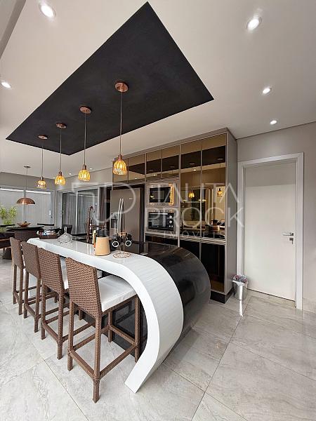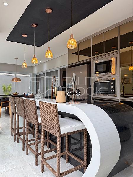 Uma única cozinha, acomodou muito bem a churrasqueira, linda bancada, com apoio para refeições rápidas e mesa para 8 lugares. A lavanderia está ao lado, e esse espaço conta com esquadrias, possibilitando a climatização desse ambiente.