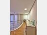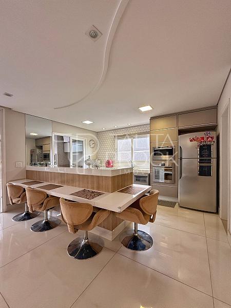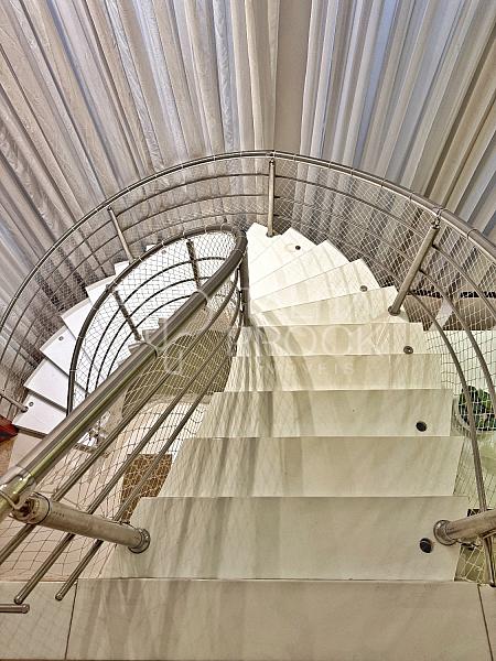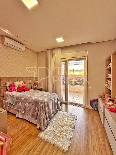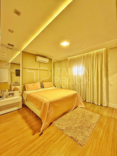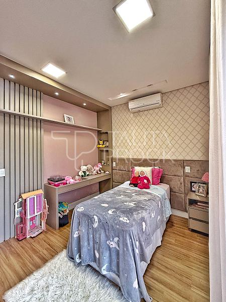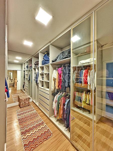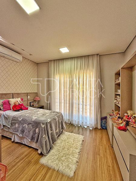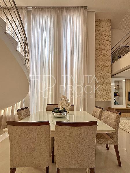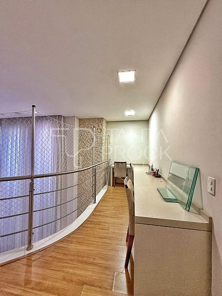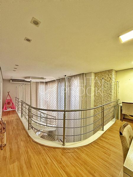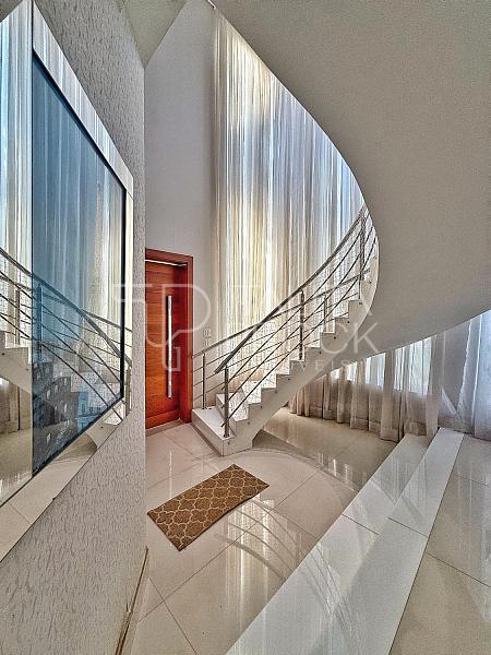 A escada toda revestida em mármore, permite acesso aos dormitórios, sendo três suites, todas com closet e persianas automatizadas, além de bancada para home office. A propriedade, conta com esquadrias em PVC, completa em marcenaria e infraestrutura pronta para climatização.