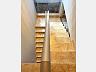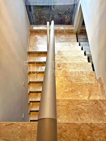 As escadas que dá acesso ao piso superior, são revestidas em mármore travertino e com ampla janela que além de deixar o ambiente claro, oferece beleza para o espaço.